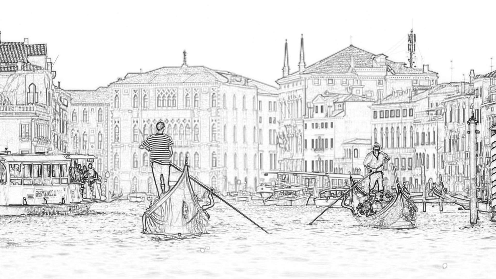A panoramic view of activity on Venice 's Grand Canal unfolds on a canvas stretching along an entire wall, eight feet across and more than four feet high. It is a sunny afternoon. An almost cloudless blue sky hovers above the distant view of a bay where gondolas cluster about a tall-masted sailing ship at anchor. A broad, placid canal punctuated with river traffic winds its way from that harbor into the foreground.